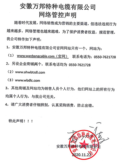 鄭重聲明:安徽萬邦特種電纜有限公司官方網站為:www_wanbangcable_com.yiwenxuan.com,除此之外無任何子網站或合作網站,其余均為假冒偽劣。電話:0550-7621728 13485756353 地 址:安徽省天長市滁州高新技術產業開發區經四路29號